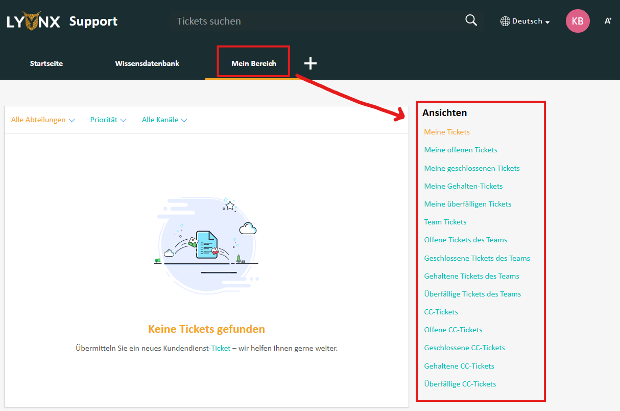 Meine Tickets: Zeigt alle Tickets an, die Ihnen zugewiesen wurden, unabhängig vom Status.